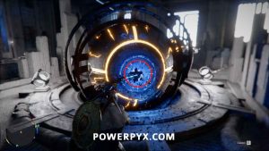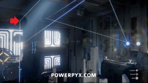 左側のボールの後ろに移動し、Axiom Force を使用してボールと対話し、レーザーを移動して右上の浮いている四角形を狙います。正しく配置されている場合、レーザーは最初のレーザーと同じボールで遠くの部屋にバウンドするはずです。ボールを制御しながらカメラを調整できるため、遠くの壁を見て、レーザーが正しい場所に向けられていることを確認します (浮遊反射板に正しく向けられていない場合、遠くの壁にあるボールを見逃す可能性があります)。