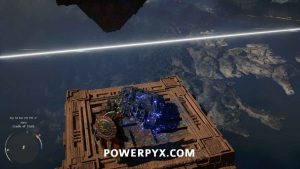 このパズルを完成させるための意図された方法は、動くプラットフォームに立って、柱のボタンをつかんでレーザーの位置を切り替えることですが、柱の上を飛び越えるだけで、部分的にチーズを作ることができます。向こう側のアビスに目を向けると、左側のプラットフォームに別の平らなパワーブロックが見えます。フォース パームで空中でブーストし、そこまで滑空します (ジャンプして空中でフォース パームを使用します)