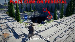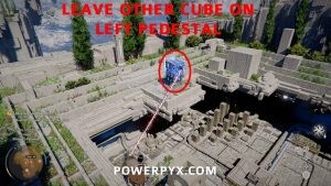 Lassen Sie den linken Würfel, mit dem Sie nicht interagieren müssen, auf dem Sockel, wo er beginnt. Wenn Sie es versehentlich entfernt haben, können Sie es wieder auf dem linken Sockel platzieren. Jeder der blau leuchtenden Würfel steht also auf einem Sockel.