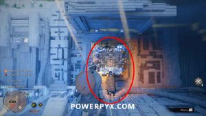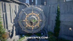 Klettern Sie aus der Grube und finden Sie das große kreisförmige Zahnrad an der Wand. Klettern Sie in die Mitte des Geräts und verwenden Sie Force Palm mit