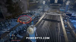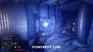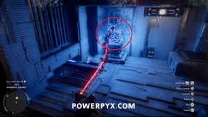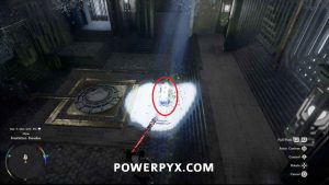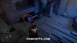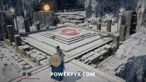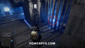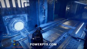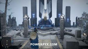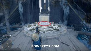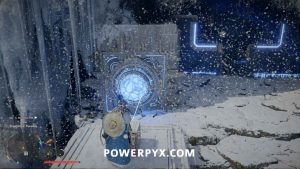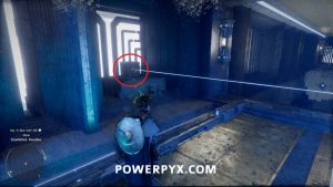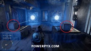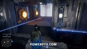 Um das Innere des Bereichs zu betreten, nehmen Sie den Blitzwürfel auf, der auf dem Boden liegt, und tragen Sie ihn dann auf die Plattform nach links. Platzieren Sie es so, dass der Laser auf die orangefarbene Kugel zeigt. Wenn dies richtig gemacht wird, wird das Kraftfeld abgesenkt, sodass Sie das Gebäude betreten können.