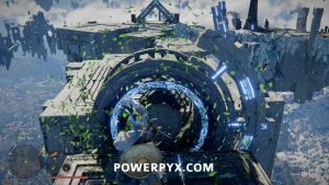 und stelle dich mit dem wirbelnden Wind gegen die runde Rückseite der Plattform. Dadurch werden Sie mit dem Teleporter zur Plattform geschoben.