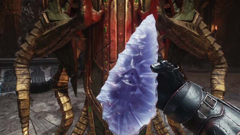 Secret # 2 (Sigil de vie) + Collectible # 3 (Skin d'armes): Smash the Canon d'artillerie pour révéler un trou directement en dessous. Descendez pour trouver de l'or et une porte clé jaune – la porte a une méga-up de santé et un coup de BFC. Dans la même zone, retournez-vous et écrasez le mur de marquage bleu avec une charge de bouclier pour récupérer un sceau de vie.