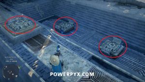 Mueva el núcleo de energía para voltear la plataforma izquierda nuevamente, luego retire ambos bloques de energía planos y colóquelos en el medio y en la derecha para que la ranura del medio y ambas ranuras del lado derecho estén llenas. Luego mueva el núcleo de energía nuevamente al pedestal para girarlo hacia el lado derecho y descender al área inferior.