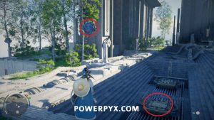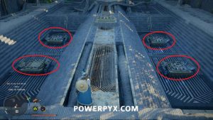 El rompecabezas en esta área consiste en agarrar más bloques de energía del área subterránea, a los que se llega volteando las dos placas de metal con las ranuras planas para bloques de energía. Primero, agarre el bloque de alimentación plano en el aire a la izquierda y péguelo en la ranura de la placa de metal izquierda.
