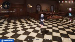 Date la vuelta y acércate a la mesa de café junto a los sofás marrones. Interactuar con el teléfono.